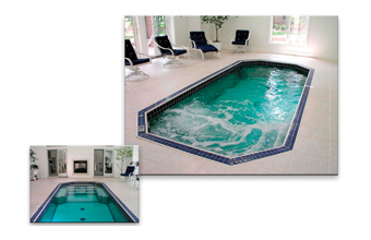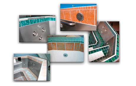 Our standard tile trim application for a spa includes tiling the top lip, water line, steps and the entire floor. If requested, a non-slip tile, with a greater than .06 coefficiency of friction rating can be used where requested within the spa. Tiles are inlaid flush with the surrounding surface of the vessel so that there is a smooth transition from tile to Stainless Steel.